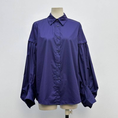 Elegant Navy Blue Puff Sleeve Shirt Loose Lapel Long Sleeve Top