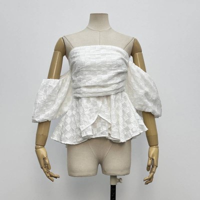French Style Checked Jacquard Off-Shoulder Waist-Cinched Ruffle Blouse