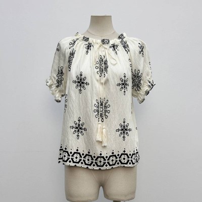 Vintage Embroidered Tie Neck Short Sleeve Chiffon Top Loose Vacation Style Pullover