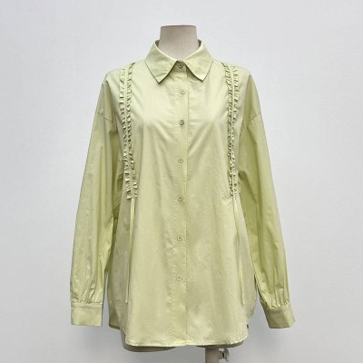 Fresh Light Green Ruffle Trim Lapel Long Sleeve Shirt