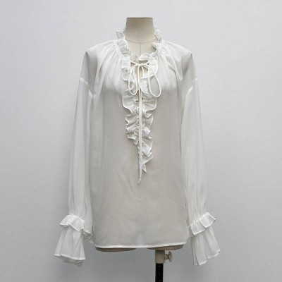 White Ruffled Tie Neck Chiffon Blouse Elegant Long Sleeve Sheer Top