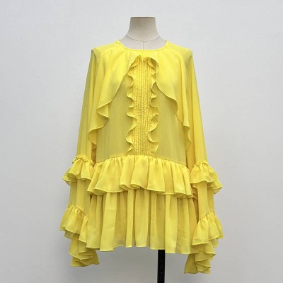 Elegant Ruffled Yellow Chiffon Top Loose Long Sleeve Age-Reducing Blouse