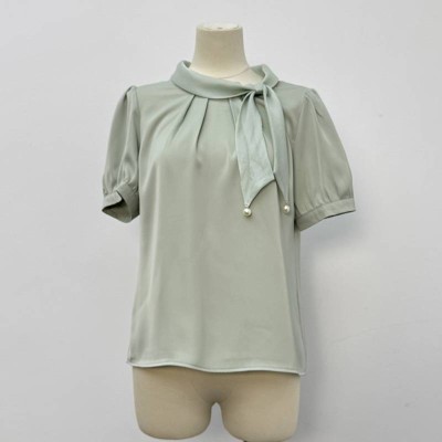 Elegant Tie-neck Pearl Decor Short Sleeve Chiffon Blouse Light Green Temperament Top