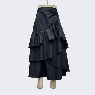 Black Ruffled Drawstring Asymmetrical Midi Skirt