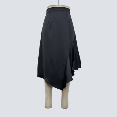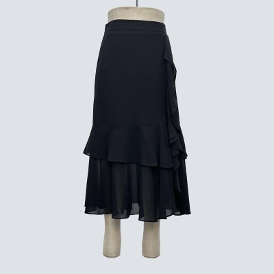 Black Ruffled Chiffon Midi Skirt with Irregular Hem Slimming Style