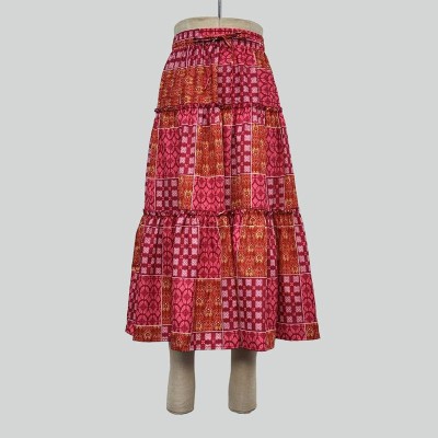 Vintage Patchwork Drawstring Ruffled Midi Skirt