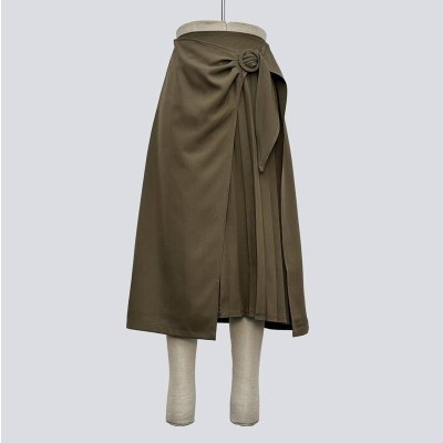 Designer Tie-Waist Pleated Midi Skirt Vintage Brown-Green Slim Fit Skirt