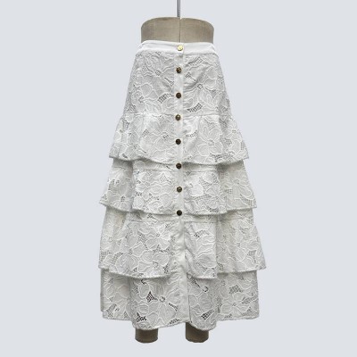 White Lace Ruffled High Waist Button-front Midi Half Skirt