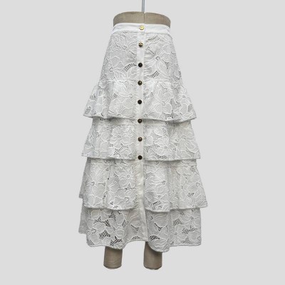 White Lace Ruffle Button Midi Skirt Elegant High Waist Tiered Skirt