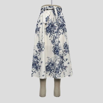 Chinese Style Blue and White Printed Tie-Waist Midi Skirt