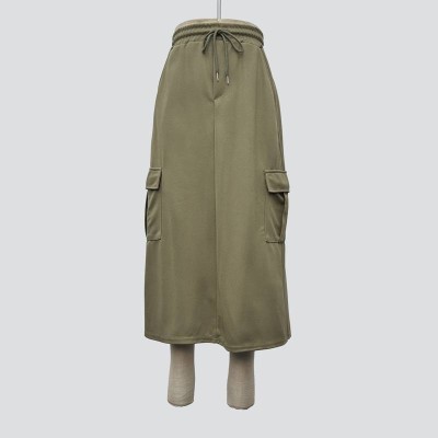 Army Green Drawstring Cargo Style Fake Two-Piece Midi Skirt