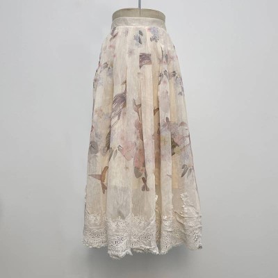 Literary Style Floral and Bird Print Lace Patchwork Midi Skirt