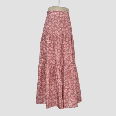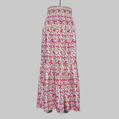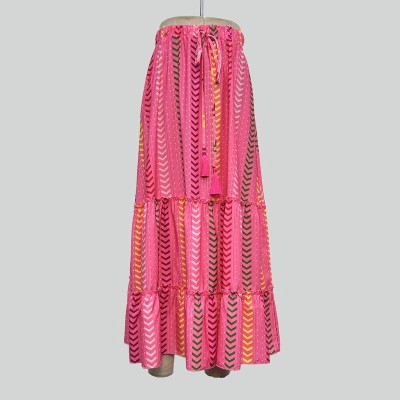 Pink Printed Drawstring Tassel Decorated Tiered Long Skirt