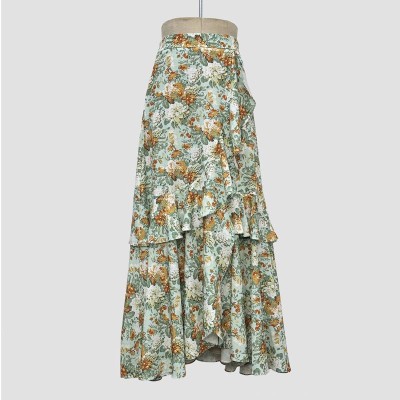 Vintage Floral Ruffled Maxi Skirt High Waist Slim Print Long Skirt