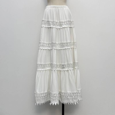 White Lace Patchwork Elastic Waist Maxi Skirt Fairy Style Slimming Tiered Skirt