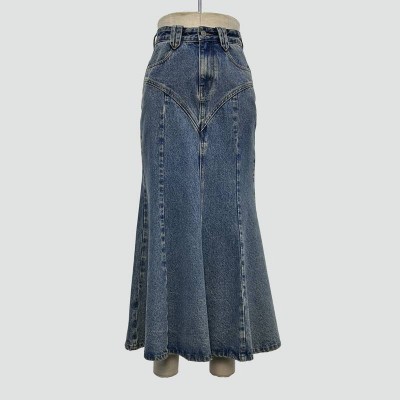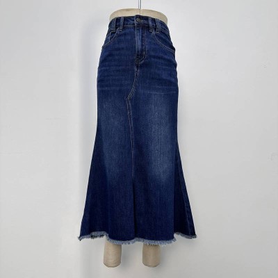 Vintage Frayed Denim Mermaid Maxi Skirt High Waist Slimming Denim Long Skirt