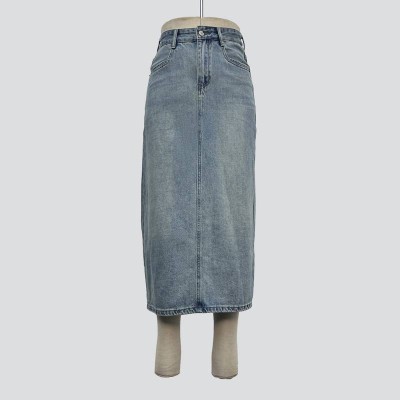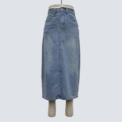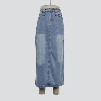 Vintage Washed Denim Maxi Skirt High Waist Slim Fit Mid-length Denim Skirt