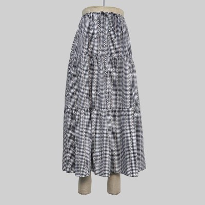 Vintage Black White Gingham Drawstring High Waist Maxi Skirt Ruffled A-line Swing Skirt