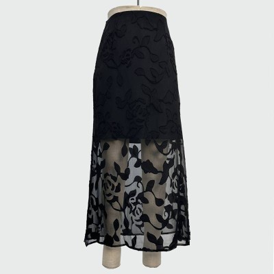 Black Flocked Pattern Sheer Patchwork Maxi Skirt