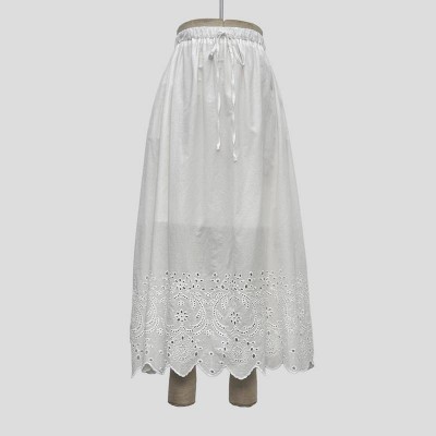 Literary Style White Hollow Embroidered Drawstring Waist Maxi Skirt