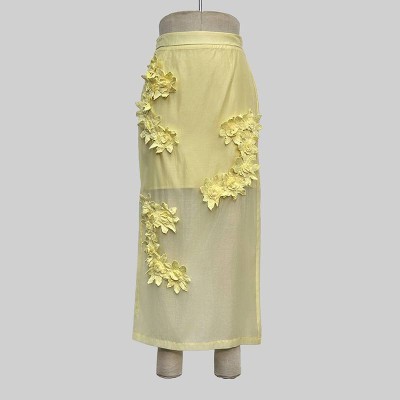 Yellow Maxi Skirt with 3D Floral Appliques and Sheer Detail