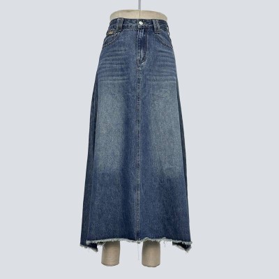 Vintage Washed Frayed Hem Denim Maxi Skirt
