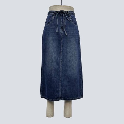 Vintage Drawstring High Waist Denim Maxi Skirt