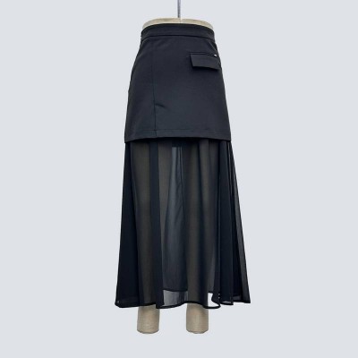 Stylish Mesh Patchwork Black Maxi Skirt High Waist Slim Double-layer Design Mid-length Skirt