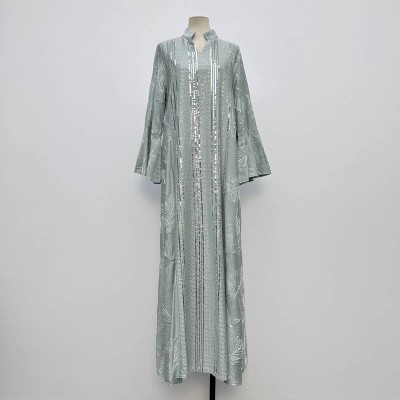 Elegant Grey-green Sequin Embellished Stand Collar Flared Sleeve Long Party Dress