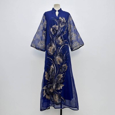 Vintage Stand Collar Sequin Embroidered Blue Long Dress Elegant Mesh Evening Gown