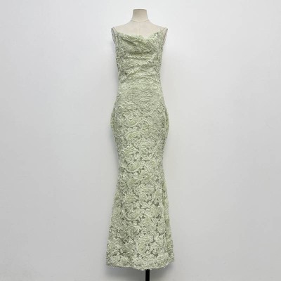 Elegant Light Green 3D Jacquard Spaghetti Strap Mermaid Maxi Dress Banquet Evening Gown