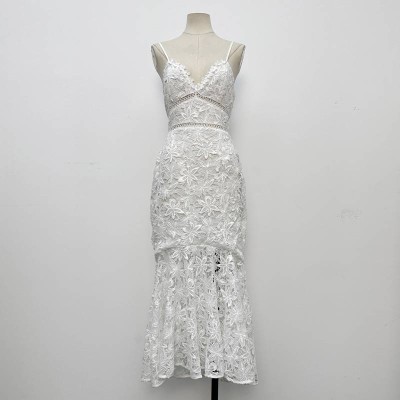 White Lace Spaghetti Strap Mermaid Midi Dress Sexy V-neck Banquet Gown