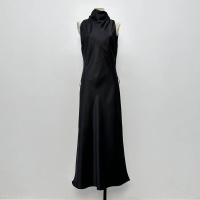 High-end Black Satin Turtleneck Sleeveless Maxi Dress Temperament Banquet Party Gown