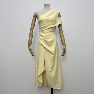 Elegant One-shoulder Ruffled Midi Evening Dress Light Yellow Slim Fit Banquet Dress