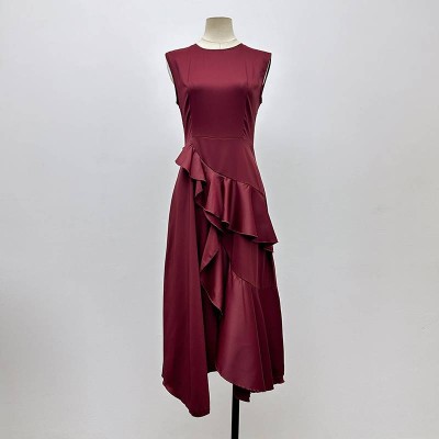 Wine Red Sleeveless Irregular Ruffle Midi Dress Elegant Banquet Gown