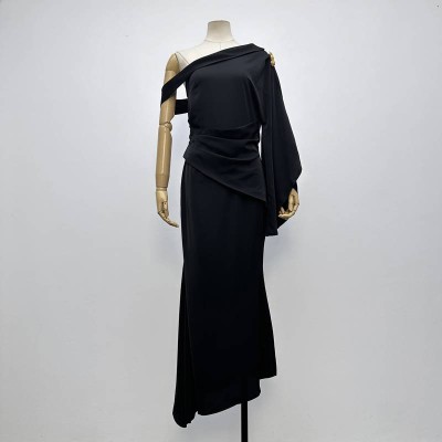 Black One-Shoulder Draped Long Evening Dress Elegant Slim Banquet Gown
