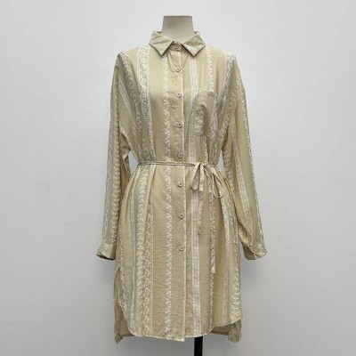Light Apricot Jacquard Waist Shirt Dress Turn-down Collar Long Sleeve Tie-up Midi Dress