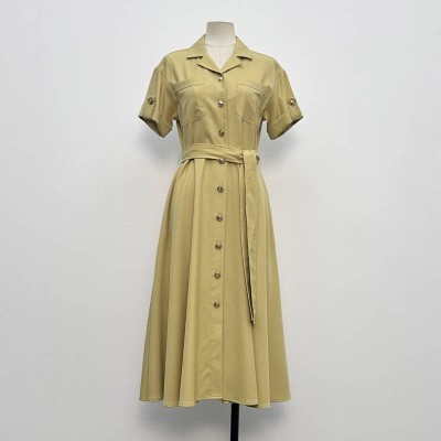 Khaki Lapel Single-breasted Waist-cinching Midi Shirt Dress