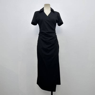 Black Lapel Waist Cinched Irregular Midi Shirt Dress