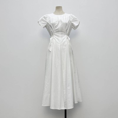 White Round Neck Waist Cinched Puff Sleeve Midi Shirt Dress