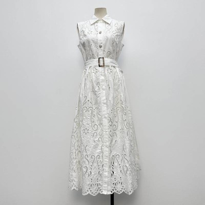 White Hollow Embroidery Sleeveless Lapel Waist-cinched Midi Shirt Dress