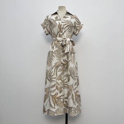 Plant Print Lapel Waist-Tie Midi Shirt Dress