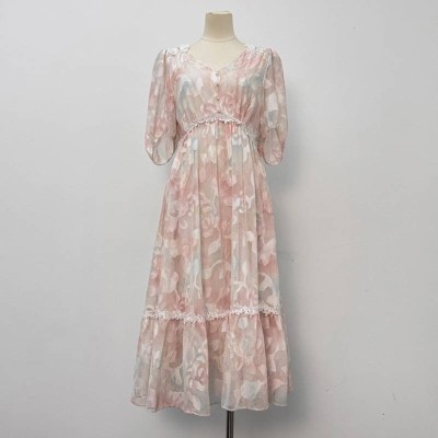 French Gentle Style Pink Floral Chiffon Midi Dress Elegant V-neck Puff Sleeve Dress