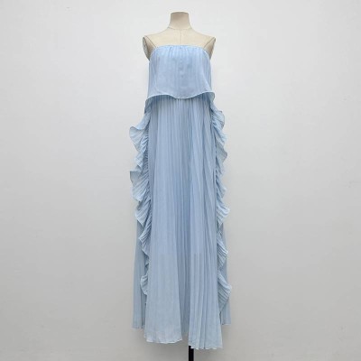 Elegant Light Blue Strapless Ruffled Pleated Chiffon Maxi Dress Sleeveless Camisole-style Formal Dress