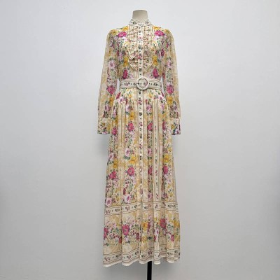 Vintage Floral Stand Collar Long Sleeve Waisted Chiffon Maxi Dress Elegant Dress