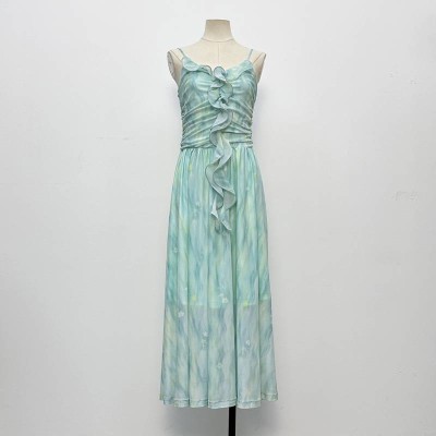 Fresh Tie-dye Ruffled Slip Midi Dress Elegant Chiffon Dress