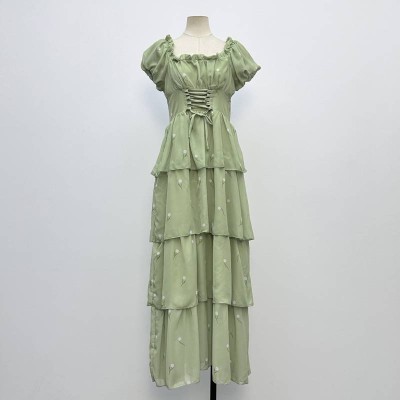 French Vintage Green Dandelion Print Off-the-Shoulder Lace-Up Chiffon Maxi Dress Tiered Ruffle Dress