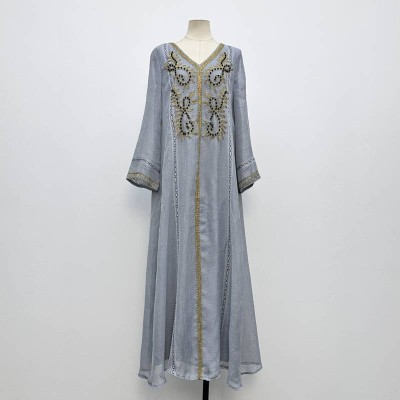 Vintage Embroidered V-neck Long Sleeve Gray Maxi Dress Loose Temperament Long Dress