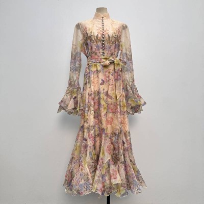 Stand Collar Floral Chiffon Maxi Dress, Elegant Ruffle Hem Evening Dress