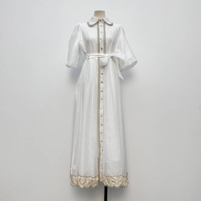 French Lapel Lace Trim Waist Shirt Dress Elegant Puff Sleeve White Long Dress